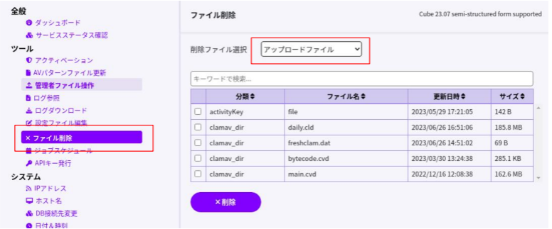 「ファイル削除」に移動し、「削除ファイル選択」で、削除するファイルのカテゴリを選択します。