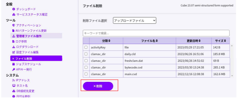 削除するファイルのチェックボックスにチェックを入れて、「削除」ボタンをクリックします。