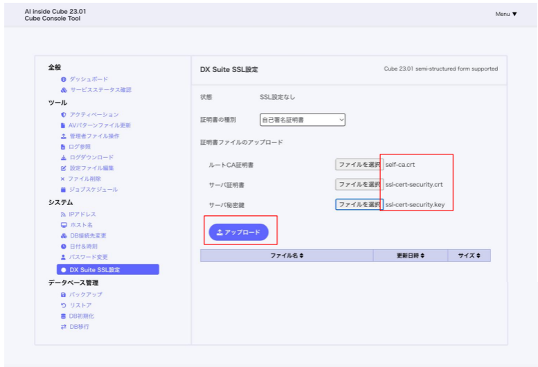 (サーバ証明書更新の場合も、サーバ秘密鍵とルート CA 証明書(自己署名証明書の場合)を合わせてアップロードしてください)