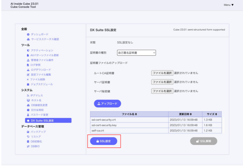 アップロードしたファイルが一覧表示されます。SSL 設定ボタンをクリックしてください。