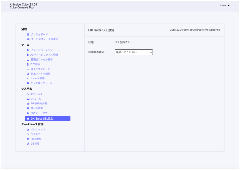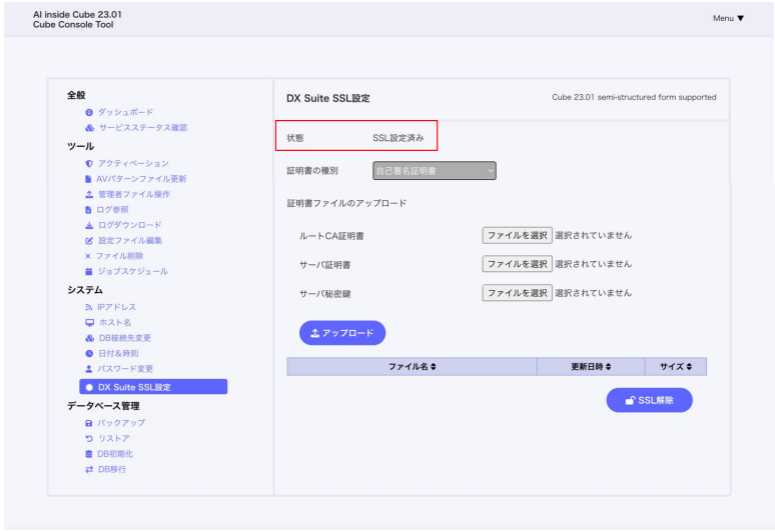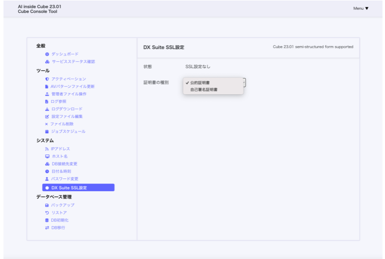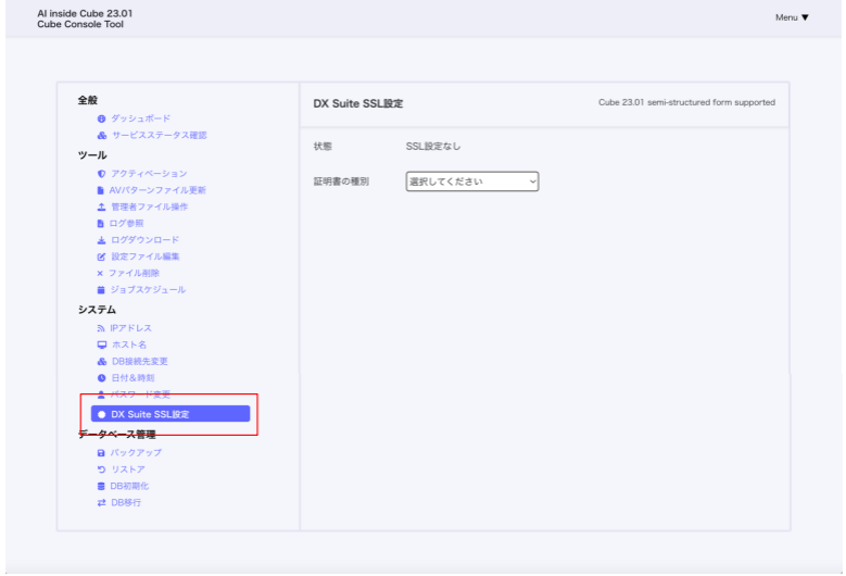 再起動完了後、Cube コンソールツールに再度接続し、DX Suite SSL 設定メニューに接続します。