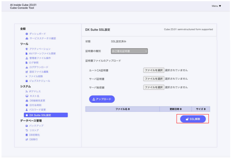 SSL 通信化設定を解除する場合は、「DX Suite SSL 設定」メニューで「SSL 解除ボタン」を押します。
