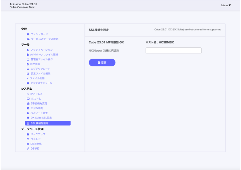 「SSL 接続先変更」は、操作対象の AI inside Cube が分離型構成の場合のみ表示されます。