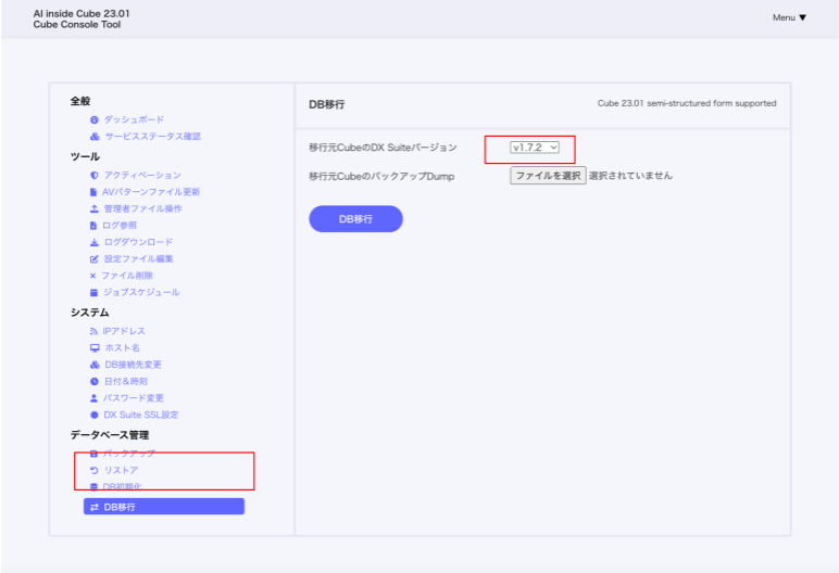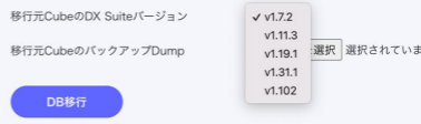 「DB 移行」に移動し、「移行元 Cube の DX Suite バージョン」のプルダウンリストから、事前準備で確認した移行元 Cube の DX Suite バージョンを選択します。