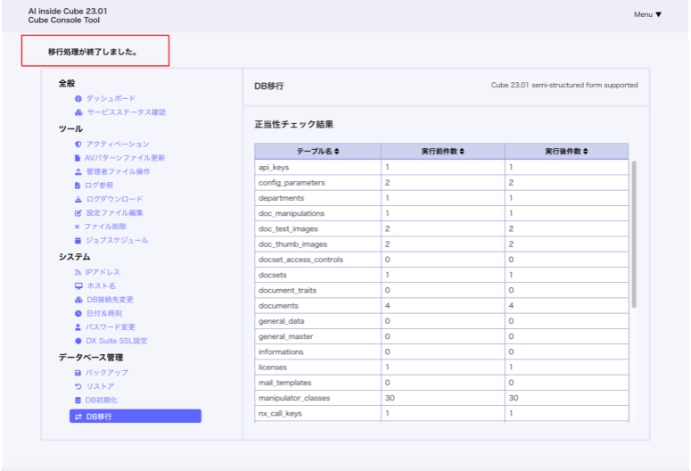 また、正当性チェック結果として移行元と移行先のデータ件数をテーブルごとに表示します。