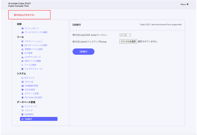 移行処理実施前に移行先 Cube の DX Suite のデータを初期化して下さい。